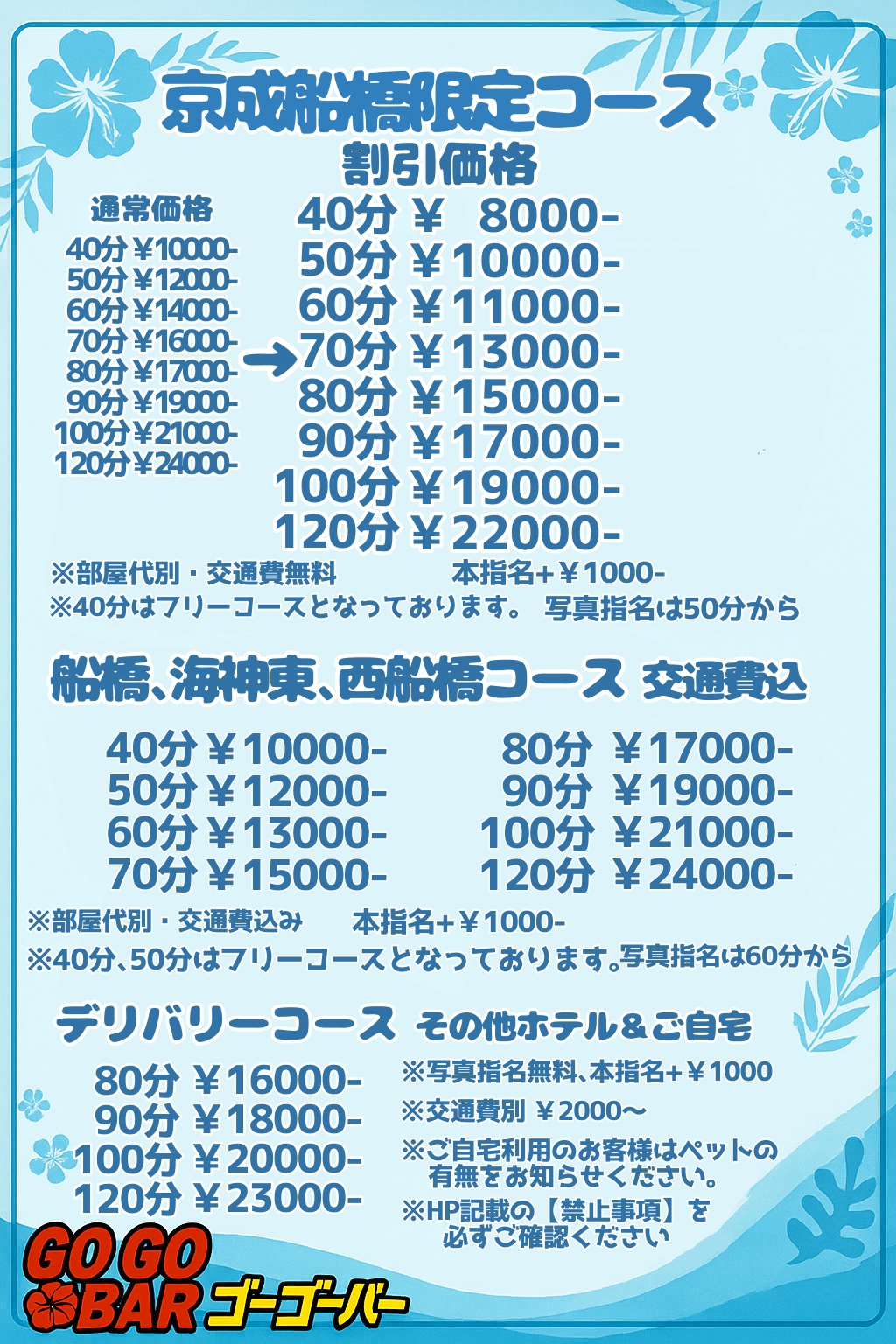 ※船橋、海神東、西船橋コースはホテル限定。